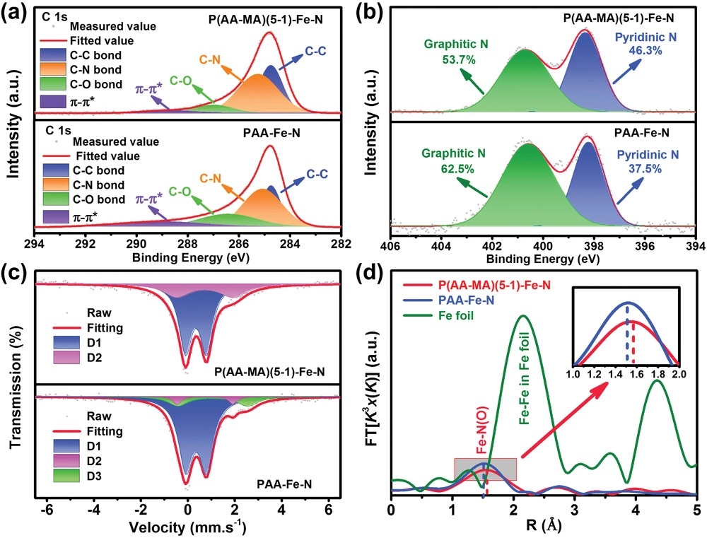为了进一步了解样品中存在的Fe-N结构,进行了57Fe Mössbauer光谱测试。如图3c所示。P(AA-MA)(5-1)-Fe-N催化剂的Mössbauer谱主要由两个双峰组成,它们分别属于高自旋的FeIII-N4 (D1)和FeII-N4 (D2)。除D1和D2位点外,PAA-Fe-N样品中还出现了一个双峰(D3)。中心位移(CS)值为1.1±0.1 mm s-1,表明它来源于高自旋的亚铁离子(D2位点),但由于四极分裂(QS)值的差异,与D2中的Fe-N配位结构不同。由于D3物种(≈15%)具有相当大的QS值,可以得知:相对于P(AA-MA)(5-1)-Fe-N,PAA-Fe-N中存在较短的Fe-N键。采用XAS检测了样品的局部Fe-N配位结构。如图3d所示,P(AA-MA)(5-1)-Fe-N和PAA-Fe-N样品均在≈1.5 Å处有明显的峰,对应Fe-N(O)第一配位壳层。与P(AA-MA)(5-1)-Fe-N相比,PAA-Fe-N中Fe-N(O)键的峰位略有负移。在P(AA-MA)(5-1)-Fe-N和PAA-Fe-N催化剂中,Fe-N(O)的平均键长分别为2.035和2.006 Å。这一结果与57Fe Mössbauer光谱一致,表明PAA-Fe-N的平均Fe-N(O)键长比P(AA-MA)(5-1)-Fe-N短。