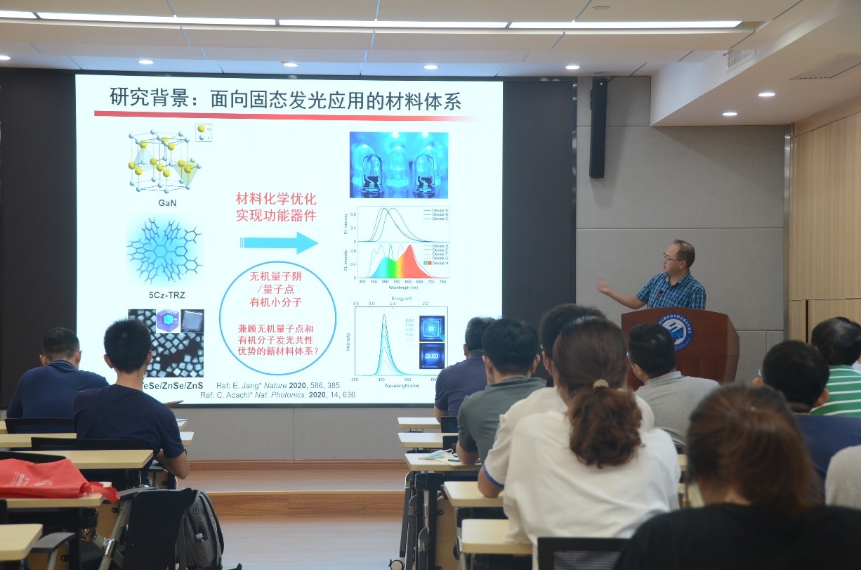 会议开始之前,翟天佑教授简单向我们介绍了姚宏斌教授的基本经历和获奖情况。报告会上,姚宏斌教授就通过结构基元调控金属卤化物的发光特性实现红、绿、蓝三原色电致发光器件应用向我们大家进行了详细的介绍。首先介绍了铅基卤化物钙钛矿在固态材料发光器件应用中的优势和当前存在的问题,随后详细介绍了其一系列工作证明结构基元调控策略可有效改善铅基卤化物的红、绿、蓝三基色电致发光特性。最后,姚宏斌教授还介绍了通过新型铜碘功能基元与配体设计,能够实现非铅铜基卤化物高效发光材料的合成与应用。