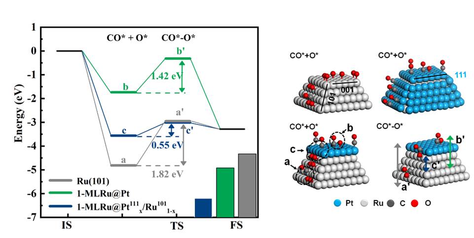 单斌教授团队进一步通过第一性原理计算探究了活性和选择性增强的内在原因,其中CO*-O*成键势垒在双功能1-ML Ru@Pt (111) x/Ru (101)1-x界面上低至0.55eV,仅为Ru(101)上的三分之一(1.82eV),并且低于1-MLRu@Pt表面上的势垒(1.42eV),相较于核壳结构进一步降低,这种促进作用可以归因于界面处的协同作用:O2在 Ru (101) 表面 解离并提供 额外的Oads ,COads在 1 ML Ru@Pt (111) x/Ru (101)1-x 的表面发生弱化吸附二者在Pt/Ru双功能界面上更容易发生反应。