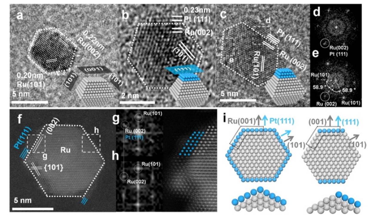 图1. 不同程度Pt包覆的Ru金属纳米颗粒的高分辨透射电镜表征。其中i图分别显示了完全包覆和选择性包覆两种构型示意。