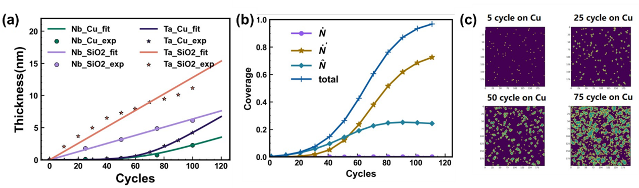 图2 Nb/Ta SALD机理分析,(a)模型拟合,(b)形核因素分析,(c)形核覆盖率变化