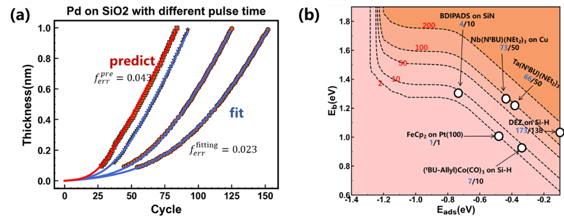 该模型可以广泛拓展到描述多种衬底上的形核延迟行为,如无定形碳上TiN和HfO2生长、SiO2表面的贵金属Pd生长等,对大量已报道的实验曲线拟合的误差在10%以内,表明该模型可以很好地描述非生长区的形核抑制行为。基于合理的参数拟合或预设,我们可以对不同ALD条件下,前驱体的形核延迟数和选择性进行很好的预测,图3(a)为采用拟合参数对Pd不同工艺时间的生长曲线预测,误差小于5%;图3(b)为基于DFT计算和工艺条件预测在不同基底上沉积材料对应的延迟形核循环数与实验真实数据的对比,我们发现该模型预测的形核延迟数与实验基本吻合,这也表明我们发展的模型具有良好的拓展性和预测能力。