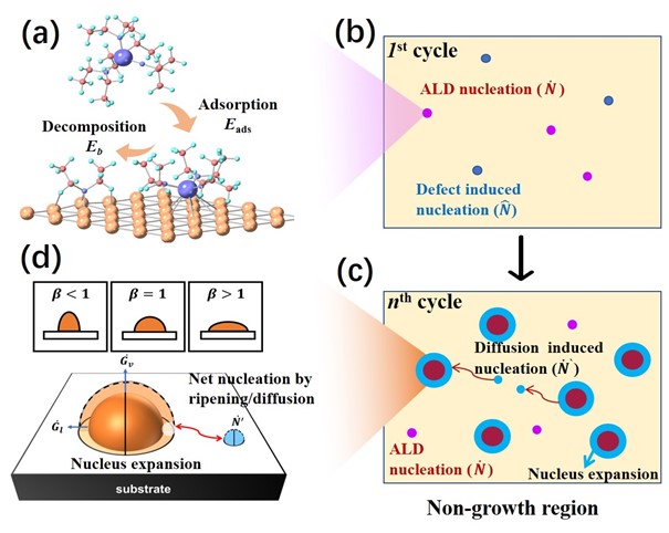 图1 ALD形核生长模型,(a)前驱体ALD反应机理,(b)ALD沉积形核与缺陷形核,(c)迁移形核及核扩展,(d)核生长的各相异性