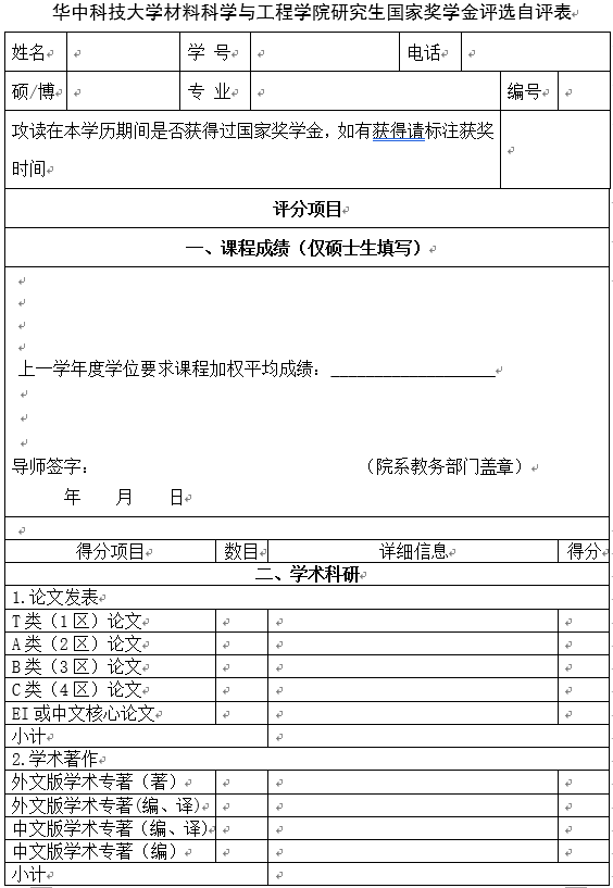 2. 申请人参照本评选细则附件中的综合测评管理评分细则,进行自我测评并填写《国家奖学金自评表》,经导师签署意见后,连同所有证明材料一起交至评审委员会。评审委员会经过审核后,确定申请人的测评分数。