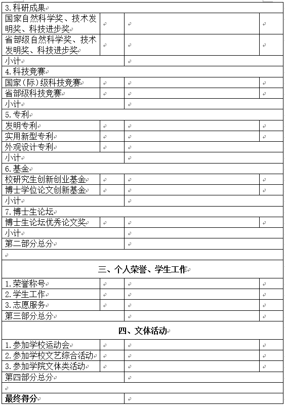分开统算,但两者都只算最高职务;(2)学校其他学生组织为学校研究生院认可的七大组织;(3)凡担任学生干部者,必须满一年,并提供相应的聘书或者证明材料,否则视为无效,不计入加分;连续多年任职的不累加;凡担任职务半年,而后未担任职务者,不予加分;但因调整职务者,按照上述对应职务的一半进行加分。例如:某同学秋季担任干事,春季上调职务,担任部长,则总分数为部长对应加分的一半和干事对应加分的一半的总和。