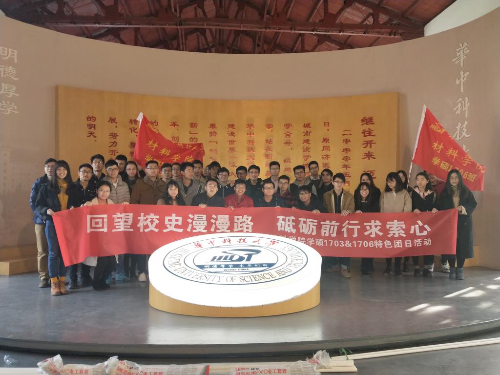 材硕1703和材硕1706党支部在2018年4月1日举办了联合特色党日活动。活动分为两个部分:校史馆参观和图书馆活动。通过校史馆的参观游览活动,领会华科一路成长索秉承的精神内涵,牢记一身为一名华科人的所需要的精神品质,牢记身为一名中国青年的历史使命,在大踏步进入全面建成小康社会的新时期,发展我们青年人的力量,高举旗帜,用崭新的面貌走向未来。