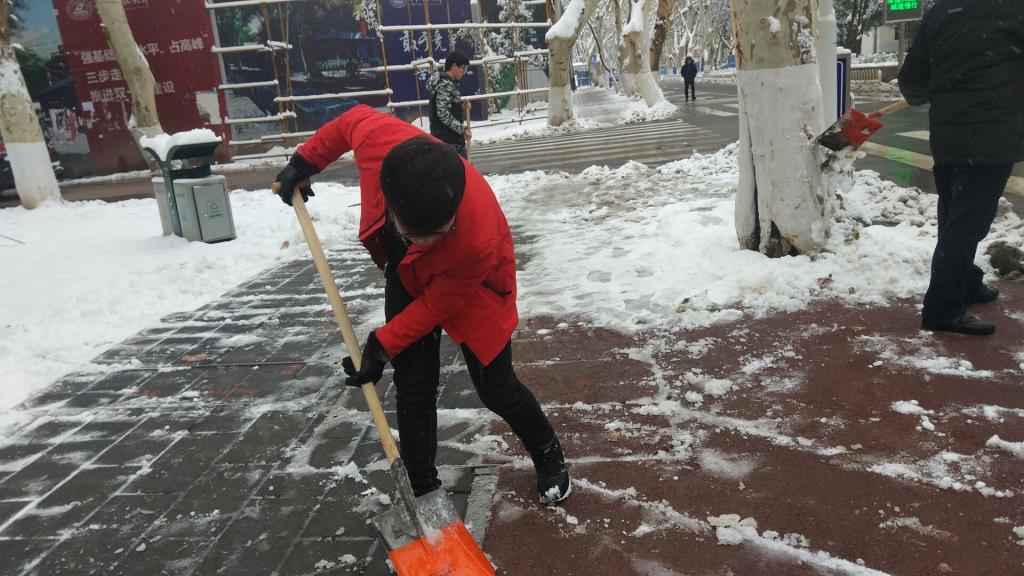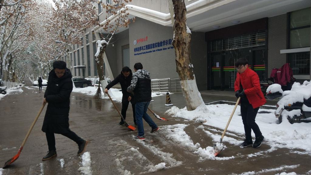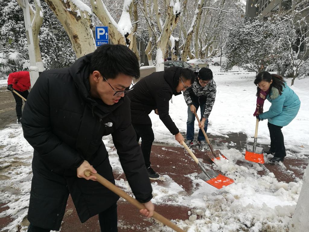 在大家的共同努力下,整个除雪活动进行的非常顺利,不到两个小时,除雪队伍分别将先进制造大楼西楼南门和北门的通路以及西楼正门道路的积雪和冻冰清理干净,随后来到澳彩