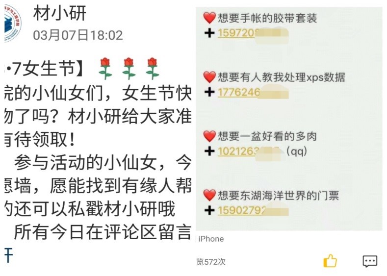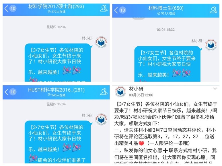 女生们纷纷在3月7日这一天通过“材小研”秀出自己的心愿,有的想要精美的手账胶带,有的想学材料分析技术为以后的科研任务铺平道路……很多心愿引起了大家的热烈讨论。通过这个活动搭建了研究生间男生与女生间沟通的平台,丰富大家的研究生生活。