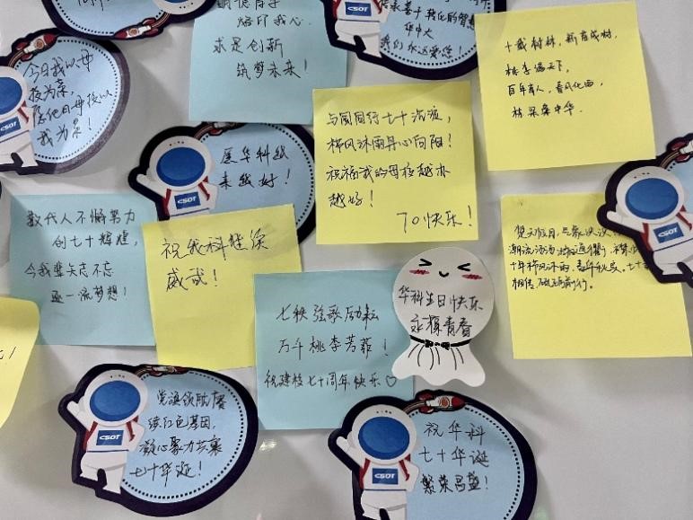 活动的最后,支部同学一起制作校庆表白墙,在便利贴上写下对学校的祝福,表达对华中大七十华诞的美好祝愿。