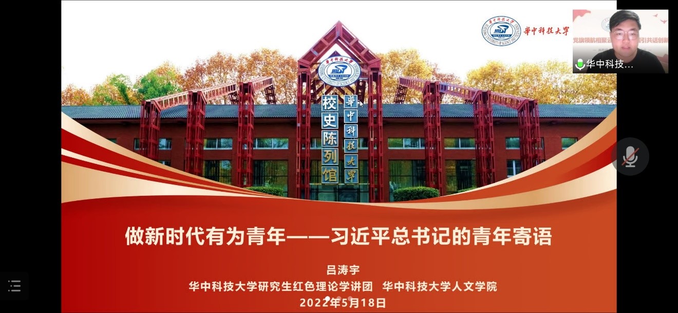 华中科技大学研究生红色理论学讲团副团长吕涛宇进行了《做新时代有为青年——习近平总书记的青年寄语》主题党课的分享。他带领我们一同从《习近平的七年知青岁月》走近习近平总书记的青年时代,从《习近平与大学生朋友们》感悟习近平总书记对青年的关怀,从建党100周年重要讲话中学习践行习近平总书记对广大青年朋友们的期望。吕涛宇同志勉励大家通过了解习近平同志对青年朋友的高度关注和殷切嘱托,看到自身使命,真正做到“不负时代,不负韶华,不负党和人民的殷切期望”。
