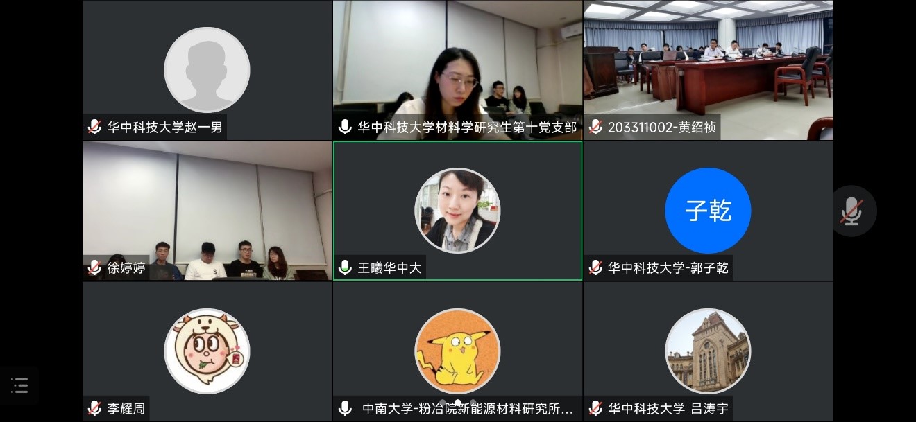 活动伊始,由华中科技大学王曦老师致开场词。在共产主义青年团成立100周年的重要时刻,两所学校的党员同志冲破疫情阻隔,相聚云端,共话科研创新,是一次互相学习、互相交流的好机会。王曦老师激励新时代的材料人,生逢其时,重任在肩,应当继承发扬五四精神,踔厉奋发,笃行不怠,心系国是校史院史事,共学共创共发展。