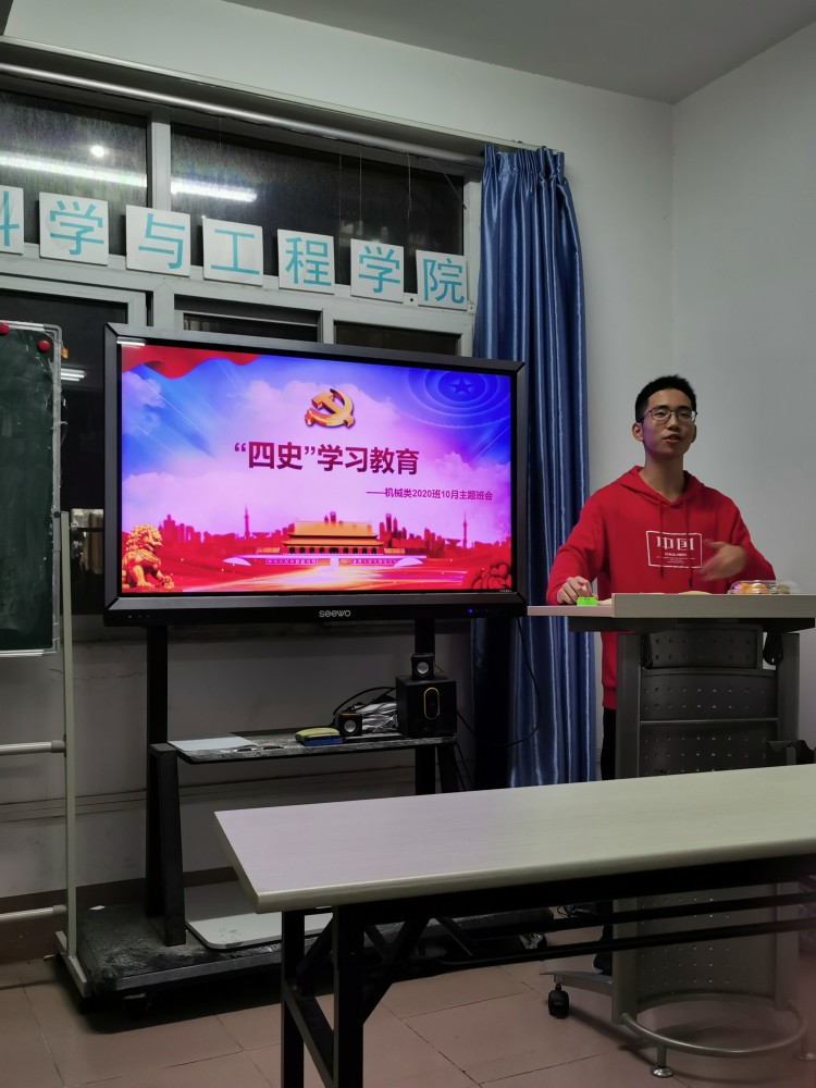 机械类2020班在韵苑14栋学生活动室举行了“四史”学习主题班会。2020班教师班主任李箐参与班会并作讲话。