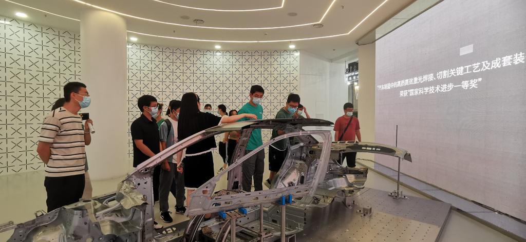 大家聚集在习近平总书记考察时驻足的“汽车制造中的高质高效激光焊接、切割关键工艺及成套业务”展台前,详细了解该项目打破外国企业近40年技术垄断,荣获国家科技进步一等奖的研发历程,特别是当同学们了解到这一项技术脱胎于华中科技大学的研发团队时,顿时为母校感到自豪。队员们了解到激光在汽车制造中的应用非常广泛,白车身已进入激光焊接时代,采用激光焊接的方式不仅可以降低车身重量、提高车身的装配精度、提升汽车制造效率、降低汽车生产成本,同时还能大大加强车身的强度,在用户享受舒适的同时,为其提供更高的安全保障。