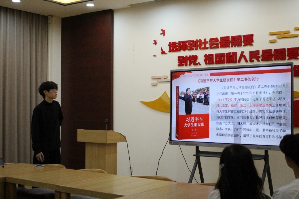 星火计划1组组长、电子封装技术2021级本科生党支部的支部书记喻非凡进行了《习近平与大学生朋友们》第二卷的导读。他从该书的发行、核心观点和主题、社会反响和学习意义、学习建议四个方面分享了关于《习近平与大学生朋友们》第二卷的感悟。
