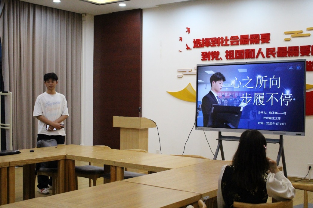 2022级本科生党支部中共预备党员修圣涵分享了主题为“心之所向,步履不停”的分享。他从“笃行不殆坚定理想信念、恪尽职守凝聚集体建设、服务社会践行初心使命”三个方面分享了自己的成长,指出新一代青年们应该坚持用党的创新理论武装头脑,时刻以党员的标准严格要求自己,立志做“勤勉奋进、增强本领”的党员学生干部。