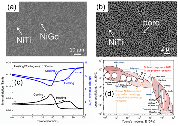 成果简介:区别于传统的粉末冶金法(自下而上)制备多孔NiTi合金时的孔隙尺寸大,孔隙大小分布不均等缺点,本成果利用全新的自上而下方法,先制备出还有Ni-Ti相的预制合金(如图(a)所示),然后利用两相在酸溶液中的反应性不同,选择性腐蚀了Ni-Gd相,从而制备出孔隙分布均匀的亚微米级多孔NiTi合金(如图(b)所示)。此材料表现出了优异的阻尼及力学性能(如图(c)所示),优于传统方法制备的多孔NiTi合金(如图(d)所示)。