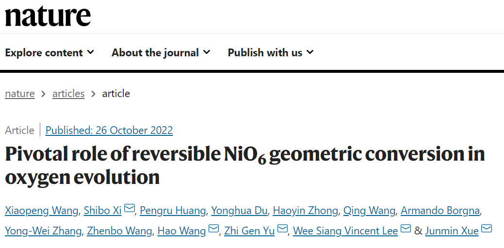 10月26日,新加坡国立大学材料系薛军民教授研究团队与新加坡科技研究局化学、能源和环境可持续性研究所席识博博士,我院校友、新加坡科技局超算研究所高级研究员、新加坡国立大学材料科学与工程系副教授余志根,新加坡国立大学机械系王浩教授合作的论文Pivotal role of reversible NiO6 geometric conversion in oxygen evolution在《自然》刊发,我院校友余志根为本文的共同通讯作者,王晓鹏为本文第一作者。