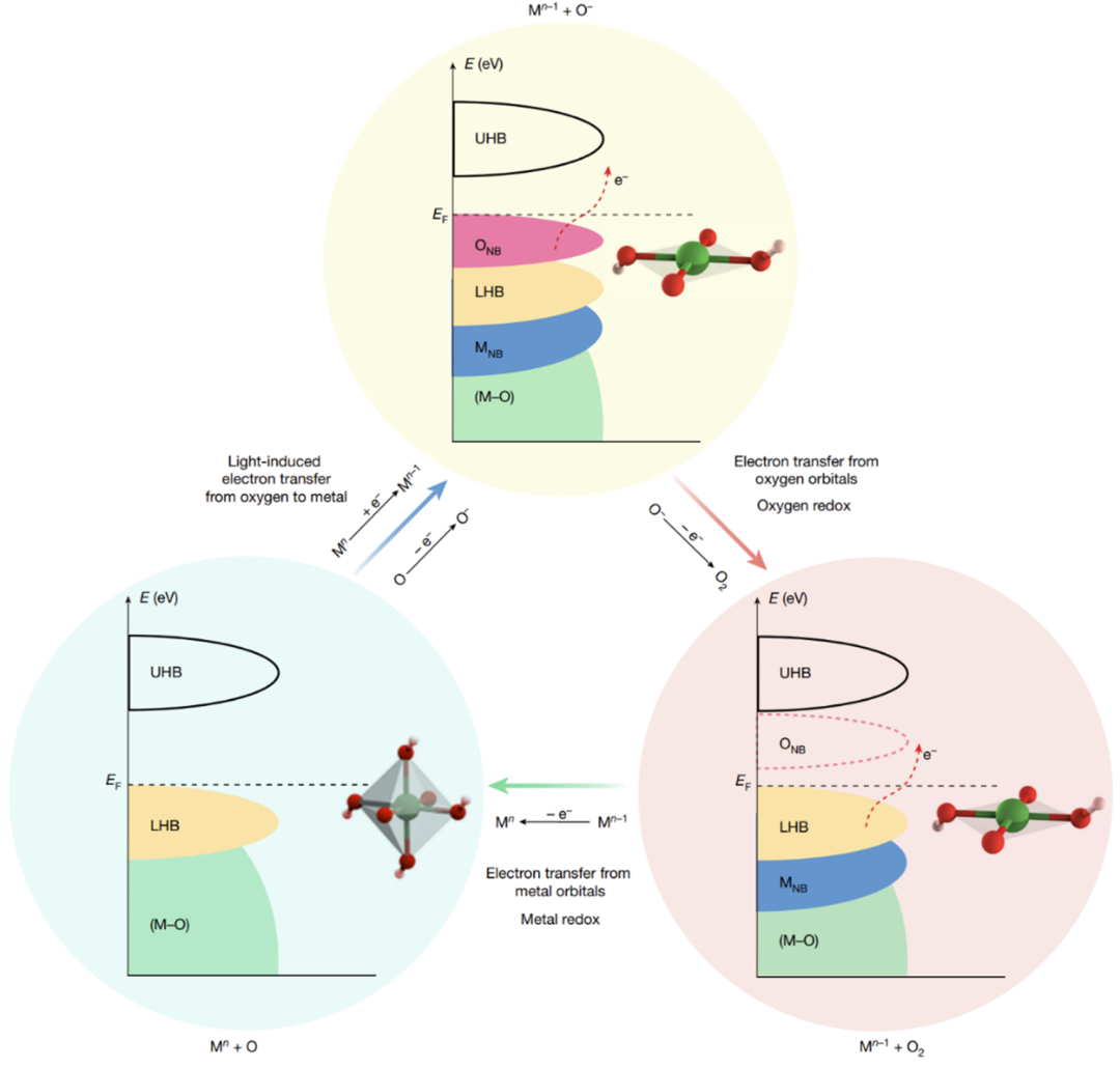 ▲图1:现有的两种OER催化机制。(a)费米能级附近电子态表现金属特性时,金属作为氧化还原中心的吸附机理(Adsorbate evolution mechanism, AEM);(b)费米能级附近电子态表现为氧时,氧作为氧化还原中心的晶格氧机理(Lattice oxygen oxidation mechanism, LOM)。(图源:Nature)