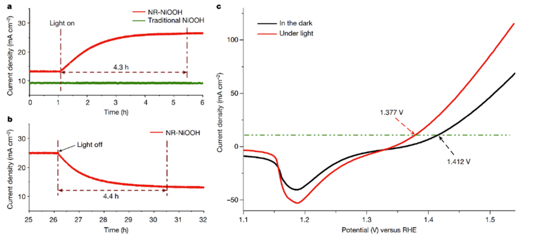 在OER性能测试中,研究人员发现他们之前报道的应变稳定羟基氢氧化镍纳米带(NR-NiOOH),Nature Communications. 11, 4647 (2020);Energy & Environment Science. 13, 229, (2020)),处于光照时性能会大幅度提升,在大约4个多小时后稳定下来;而关闭光照后,性能会逐渐回到黑暗时的状态,如图2所示。进一步实验表明,性能的提升并非源于光照引起的温度提升,电阻变化,晶粒生长及光催化。