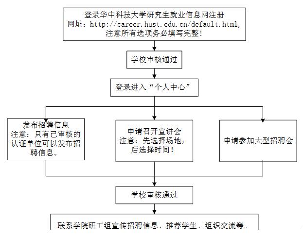 单位操作手册见:华中科技大学研究生就业信息网→用人单位→账号服务→操作手册(网址://career.aocai.org/default.html)