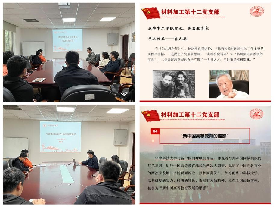 4月11日晚七点,华中科技大学材料学研究生第十党支部在机械西楼C412举办了“学校史,忆往昔”校史学习及知识竞赛活动。此次活动由党支部书记杨少婷主持,全体党员和团员参与,并邀请到学讲团成员王雨璇进行主题微党课的讲解。题目围绕校园老建筑的建造历史和蕴藏文化展开,同学们踊跃答题,比分你追我赶,将活动的气氛推向高潮。从这一环节中我们看到了各位党团员对校史学习的热忱与尊敬,本次活动达到了进一步巩固校史学习成果的目的。