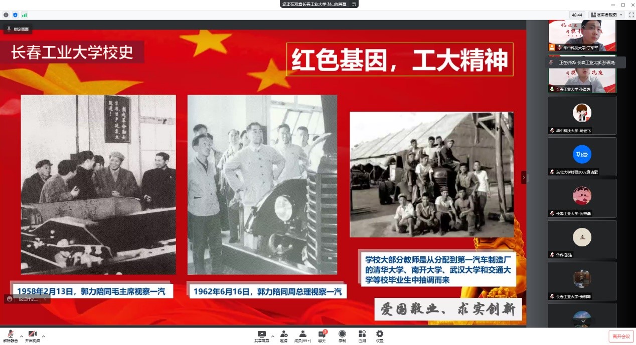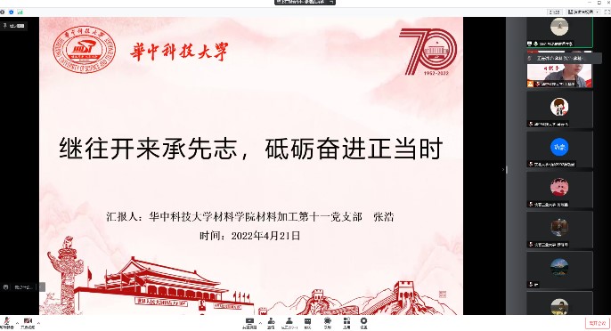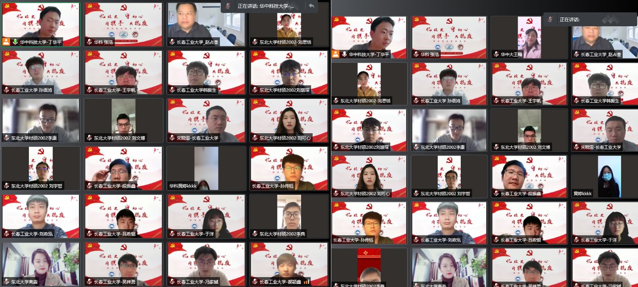 研究生工组长王曦老师首先向参会师生问好。王曦老师表示,在即将迎来华中科技大学、长春工业大学七十芳华、东北大学百年校庆的重要时刻,我们三所大学的材料学子冲破疫情阻隔,相聚云端,一起进行非常有意义的主题教育活动,共话校史院史,这样的形式和机会是非常难得的,相信本次三校联合党日活动将会是难忘的一次经历。