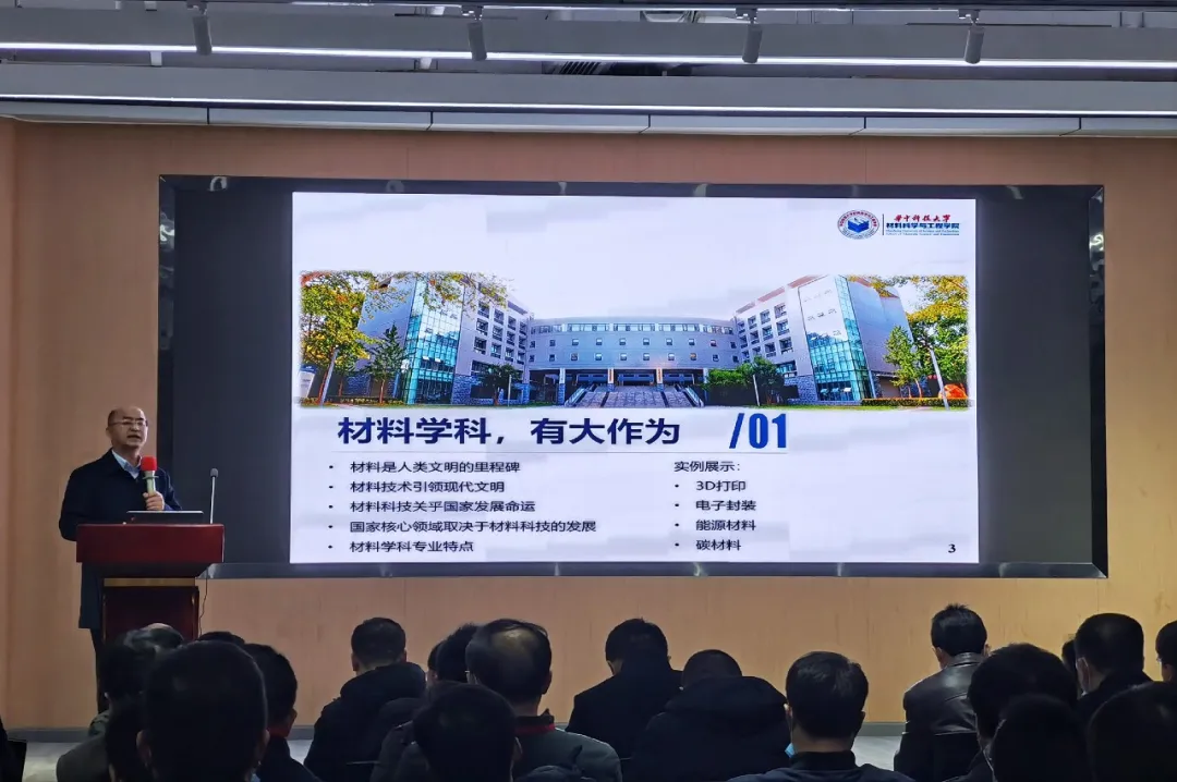 专业设置进行了介绍,本科设有材料科学与工程、材料成型及控制工程两个专业。其中材料科学与工程专业包含了新能源、半导体、新金属、光电子等材料研究,目前大家常用的华为手机快充功能的核心技术,便是由我院科研团队提供;材料成型及控制工程专业包括了3D打印、电子封装、智能成型、现代模具等研究方向,以3D打印为代表,在上世纪90年代由华中大老校长黄树槐教授牵头进行研究,到现在发展到4D打印、5D打印,华中大澳彩