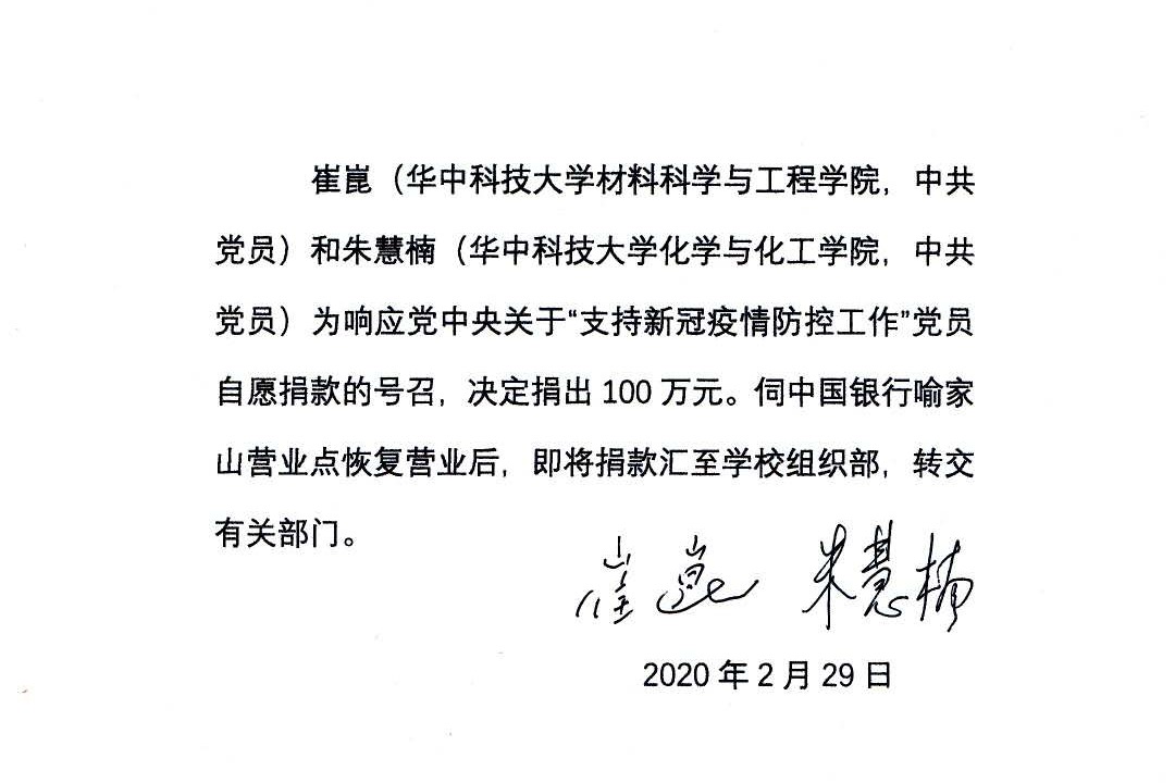为响应中央关于“支持新冠疫情防控工作”党员自愿捐款号召,崔崑院士与夫人朱慧楠教授第一时间联系澳彩