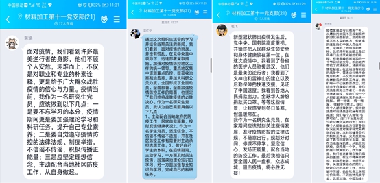 李雅倩、郭容、刘丽雪同志结合自身经历交流了自己的想法。李雅倩提到,自己身处浙江省,浙江采取了及时的科学防疫措施,率先采用了电子通行证等方式,并及时辟谣,这些措施对于安抚民众都起到了很好的效果。刘丽雪提到要及时调整自己的心态,要学会自我调整,保持良好的心理状态。郭容说到,中央及时采取各种措施,集中力量办大事,各地力量集中驰援武汉,令人感动。