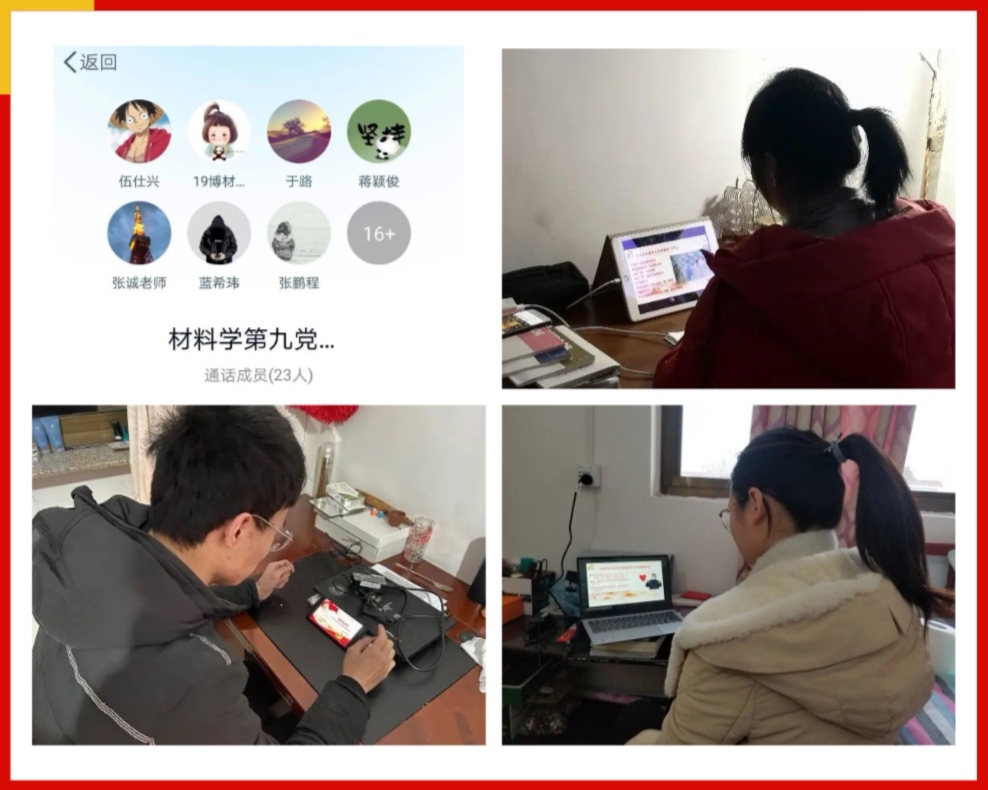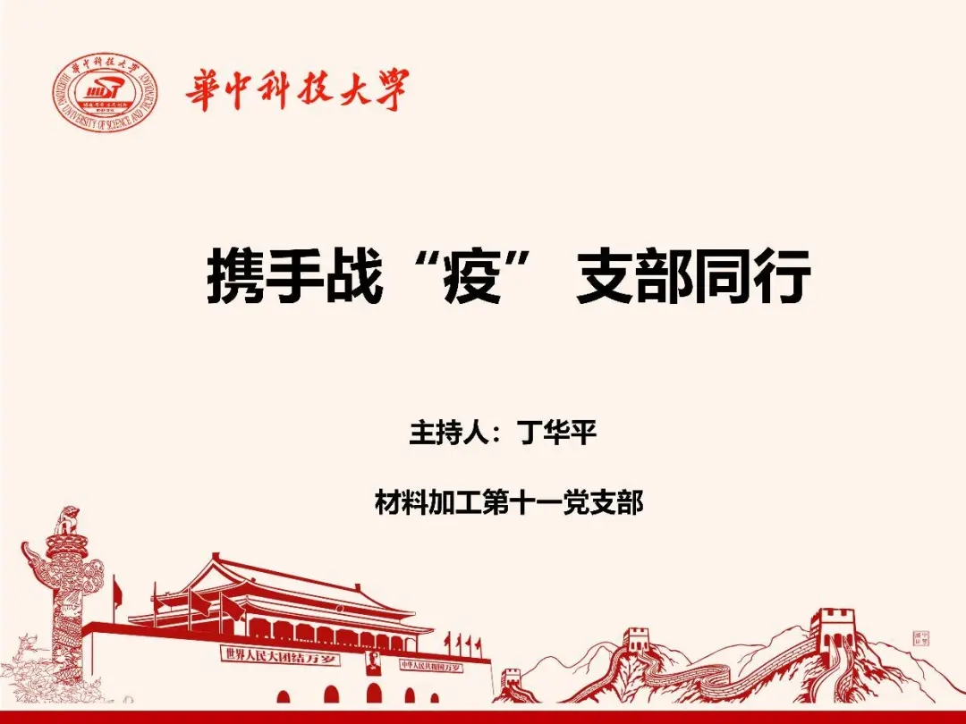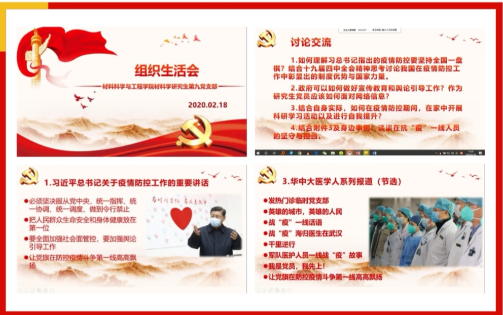 材料加工第十一党支部以线上自主学习的形式召开了党支部组织生活会。2018级材料加工博士生丁华平带领支部党员以观看新闻联播视频的形式,深入学习了习近平总书记关于疫情防控工作的重要讲话精神,并向大家讲述了在此次疫情防控中的华中大医学人“疫情不退我不退”、华中大全球校友“万众一心抗疫情”的英雄事迹。