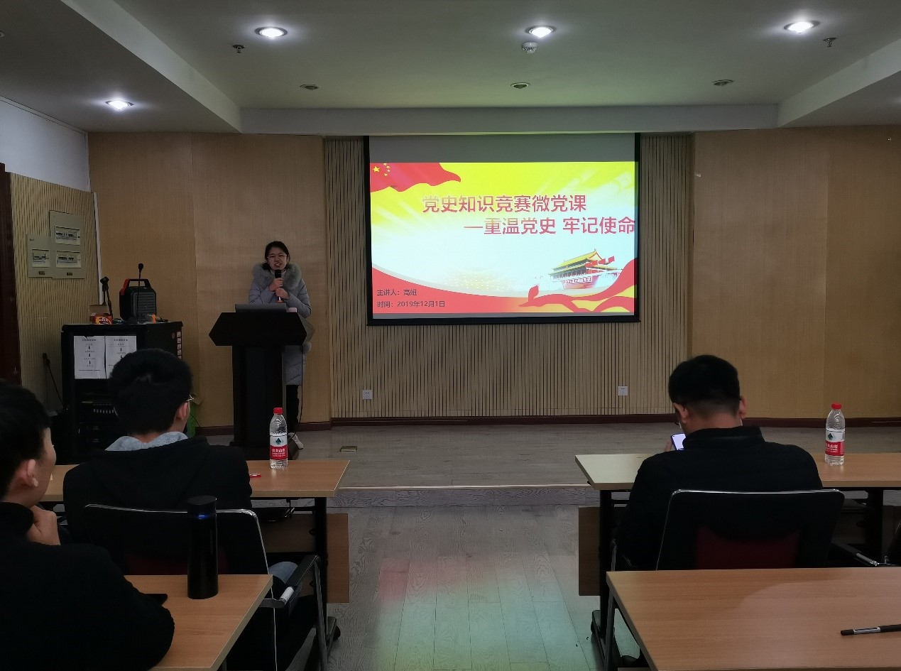 活动在蒋文海书记致辞后开始。首先是由材料加工第十三党支部书记、校红色领航员高妞进行微党课讲授,高妞同学以“重温党史、牢记使命”为主题,围绕习近平总书记关于党史的讲话,为大家讲解了从新民主主义革命到中国特色社会主义新时代的伟大历程。经过她的激情讲解,在场的研究生党员们热血澎湃,深刻地感受到祖国的强大,内心自豪感油然而生。