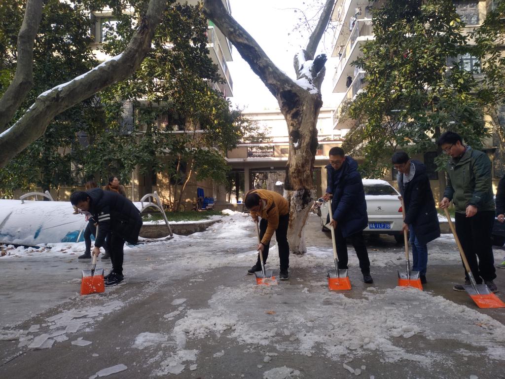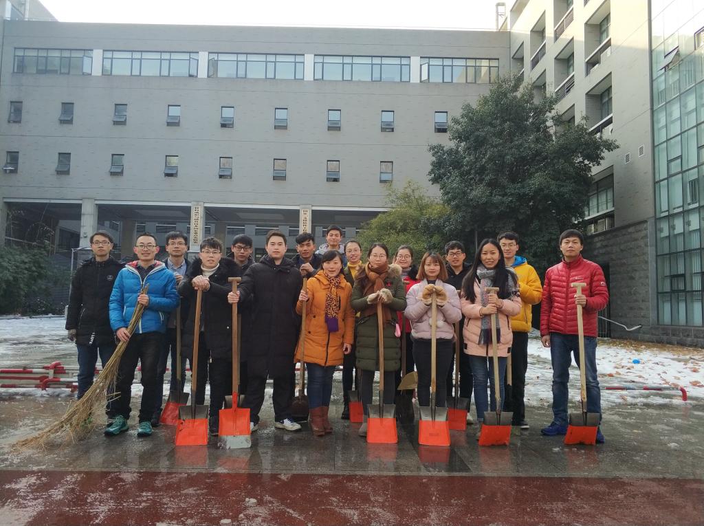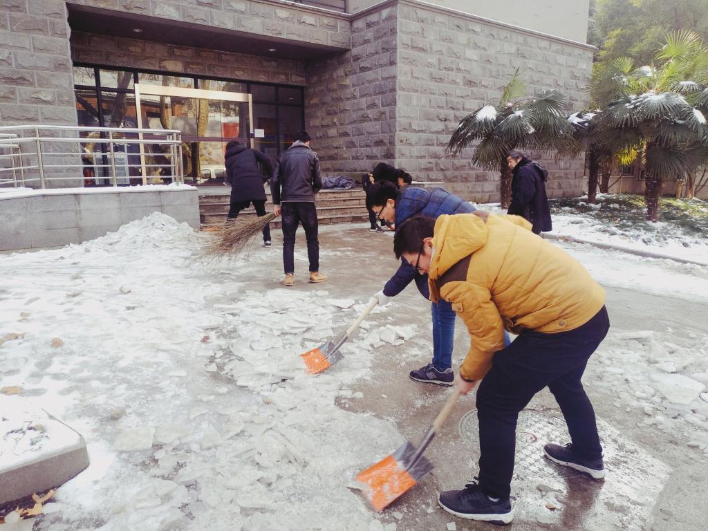 参加除雪活动的研究生共分为两组,一组同学负责清理先进制造大楼西楼南门和北门的通路,另一组同学则负责东三楼门口及道路。最后两组集合一起将先进制造大楼西楼正门道路的积雪和冻冰清理干净。