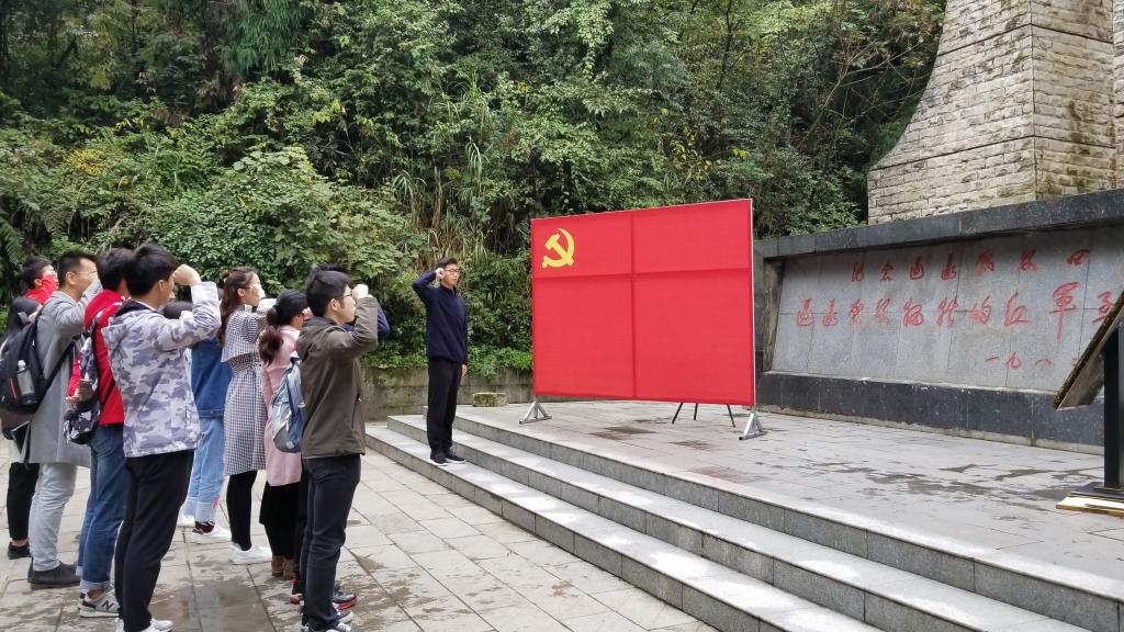 下山途中,队伍来到了红军战斗纪念碑前。在纪念碑前,队员们右手握拳,再一次集体重温了入党誓词,回音阵阵,响彻山谷。碑体刻着“遵义战役牺牲的红军烈士永垂不朽”十五个大字,展示着现代人对为革命事业做出卓越贡献烈士的敬佩与尊重。