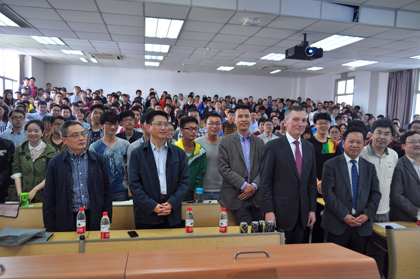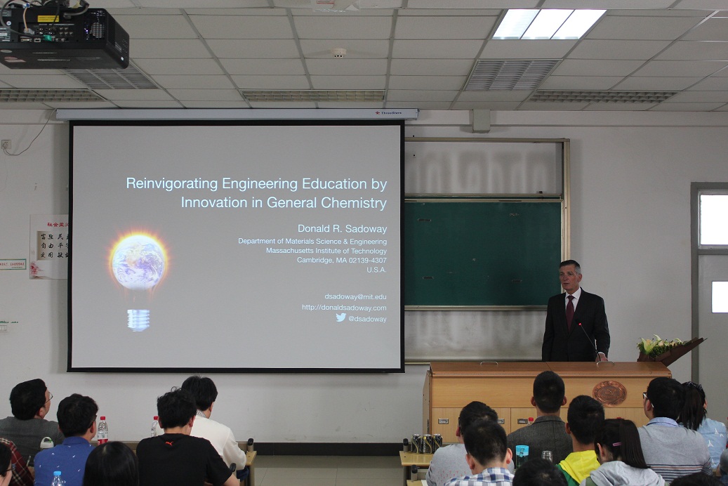 Sadoway教授向大家介绍了MIT《固态化学导论》的发展历程,以及如何构思和讲授一门针对本科生的基础课程,如何将本科教学和科学研究有机结合起来。结合原始文献和生活实例,Sadoway教授从DNA的结构、香槟的酿造原理等为大家生动讲解了固态化学的诸多重要知识等。Sadoway教授课堂教学形式多样,生动活泼,吸引了来自全校各院系300多名师生参加,受到一致好评。课后,Sadoway教授与听课的师生深入交流,合影留念,真正让大家见识了一代名师的风采。