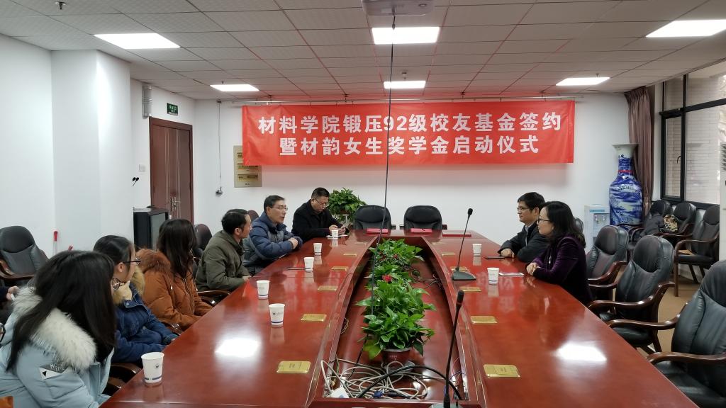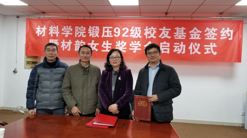 锻压92级校友基金签约暨材韵女生奖学金启动仪式举行。院长周华民、副院长袁新华、校基金事务处办公室主任苏锐参加仪式。