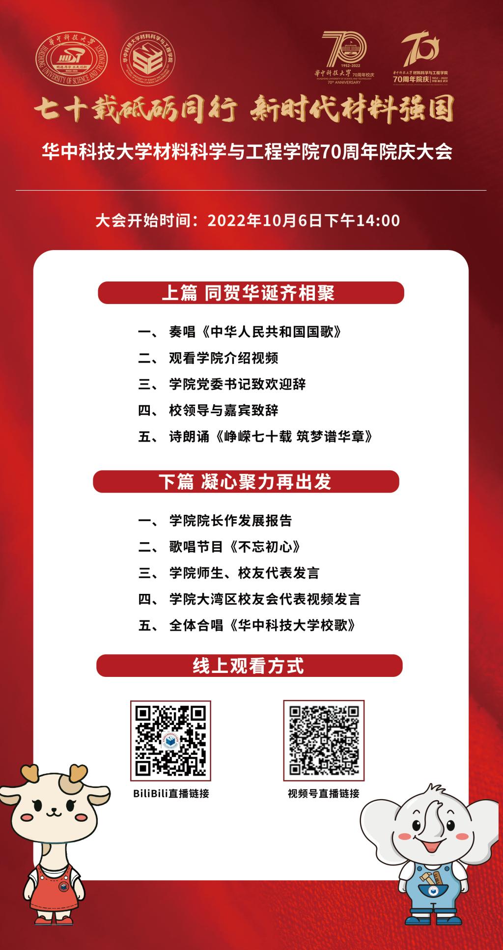 10月6日下午14点,“华中大澳彩 ”微信视频号,“华中大材料新宣”B站账号双平台官方直播