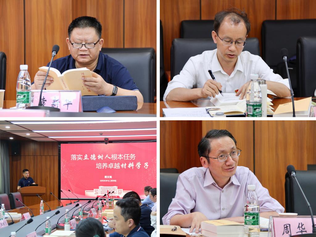 党委副书记蒋文海领学了“落实立德树人 培养卓越材料学子”为主题的报告,院长周华民、副院长袁新华分享学习体会。