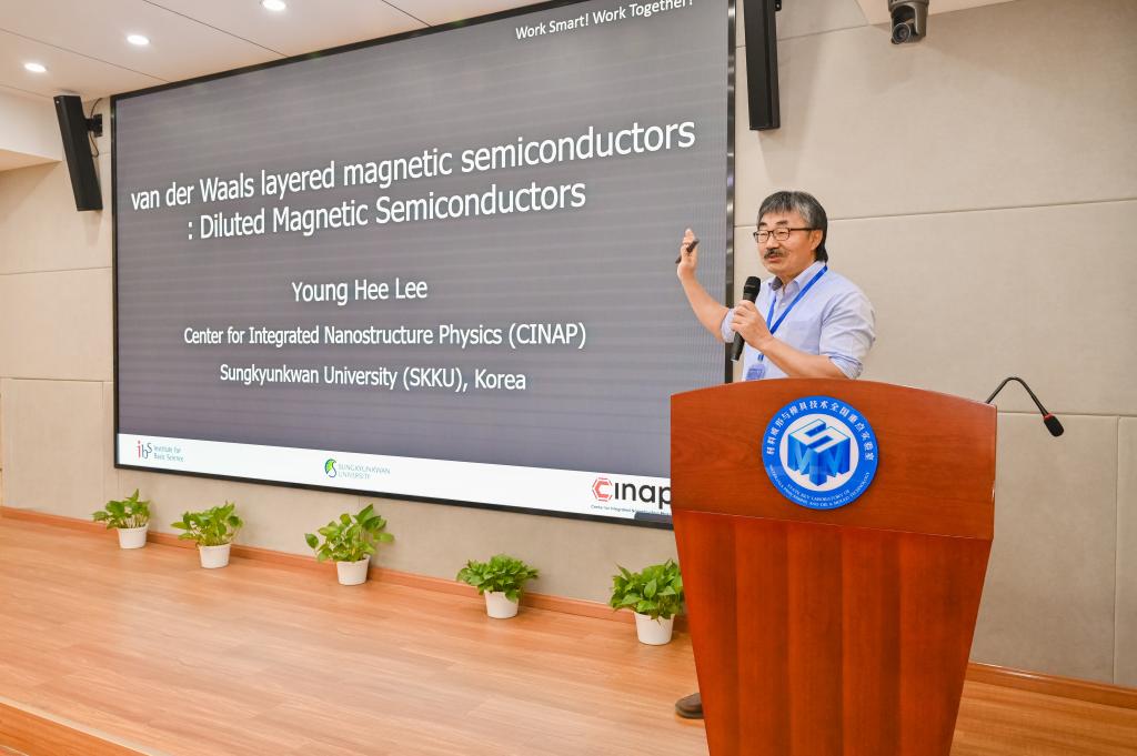 外籍院士、韩国成均馆大学李永熙教授做题为“范德华层状磁性半导体:稀磁半导体”的专题报告。李永熙院士的研究工作主围绕着二维铁磁性材料展开,利用磁性元素钒掺杂的二维WSe2实现了室温铁磁性和低掺杂浓度下的栅压可调性。该成果为改变铁磁材料的居里温度开辟了新路径,有望进一步推动二维铁磁材料的研究与应用。
