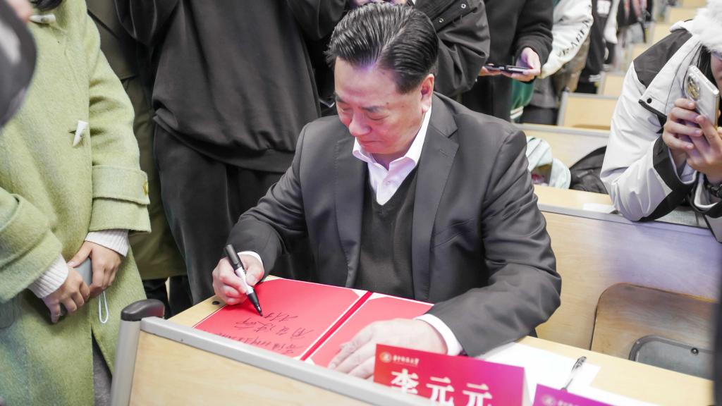报告会后,李元元院士在同学们的簇拥下签字留念,期望同学们倍加珍惜在华科大校园求学的时光,努力成为堪当强国建设、民族复兴大任的栋梁之材。