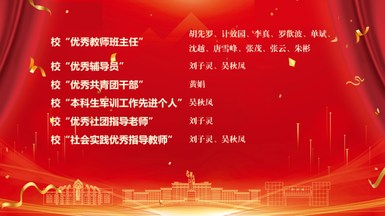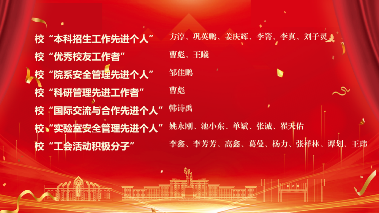 深耕不辍、笃行不倦,荣获校“先进基层党组织”,第三批全国党建工作样板支部通过验收,荣获校第二批“双带头人”教师党支部书记工作室、校“实验室安全管理先进单位”、校“校友工作优秀校友组织”、校“学生工作优秀奖”、校“五四红旗团委”、校“教师班主任优秀工作单位”、校“优秀社团指导单位”等荣誉称号。文体工作方面,我院荣获校秋季运动会教工甲组团体总分第三名、校教职工“团结杯”乒乓球团体赛甲组第五名、校教职工“团结杯”篮球赛第五名、校“十月华章”教职工歌咏汇演活动三等奖。