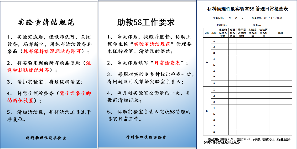 材料物理性能实验室通过科学规划教学空间,优化设备布局,实施座位编号管理制度,既提升了教师管理效率,又培养了学生的规范意识。实验室还创新性地将5S管理理念可视化,通过墙面宣传板强化师生认知。目前,实验室已实现设备定位管理、物品分类存放,整体环境整洁有序,教学空间利用率显著提升,展现出标准化管理的示范效应。