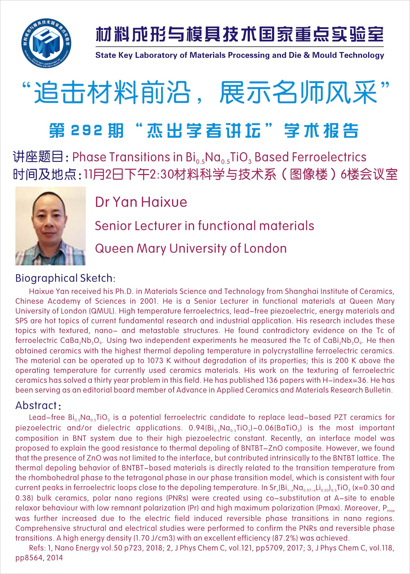 第292期杰出学者讲坛——Dr Yan Haixue Queen Mary University of London