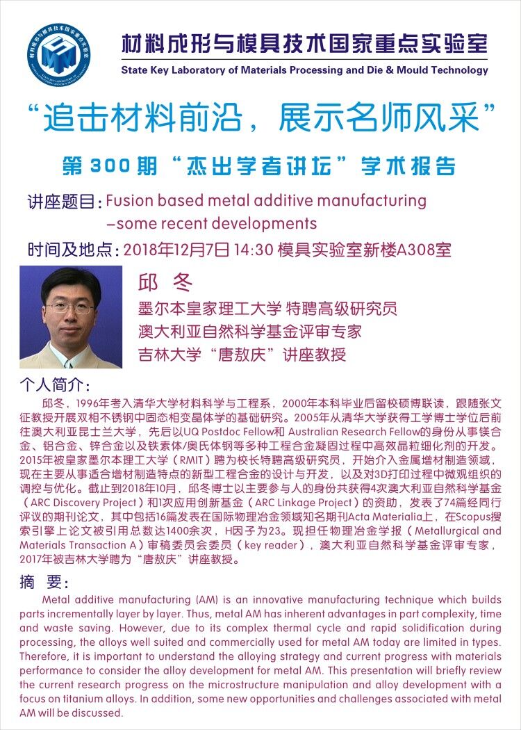 第300期杰出学者讲坛——墨尔本皇家理工大学邱冬高级研究员