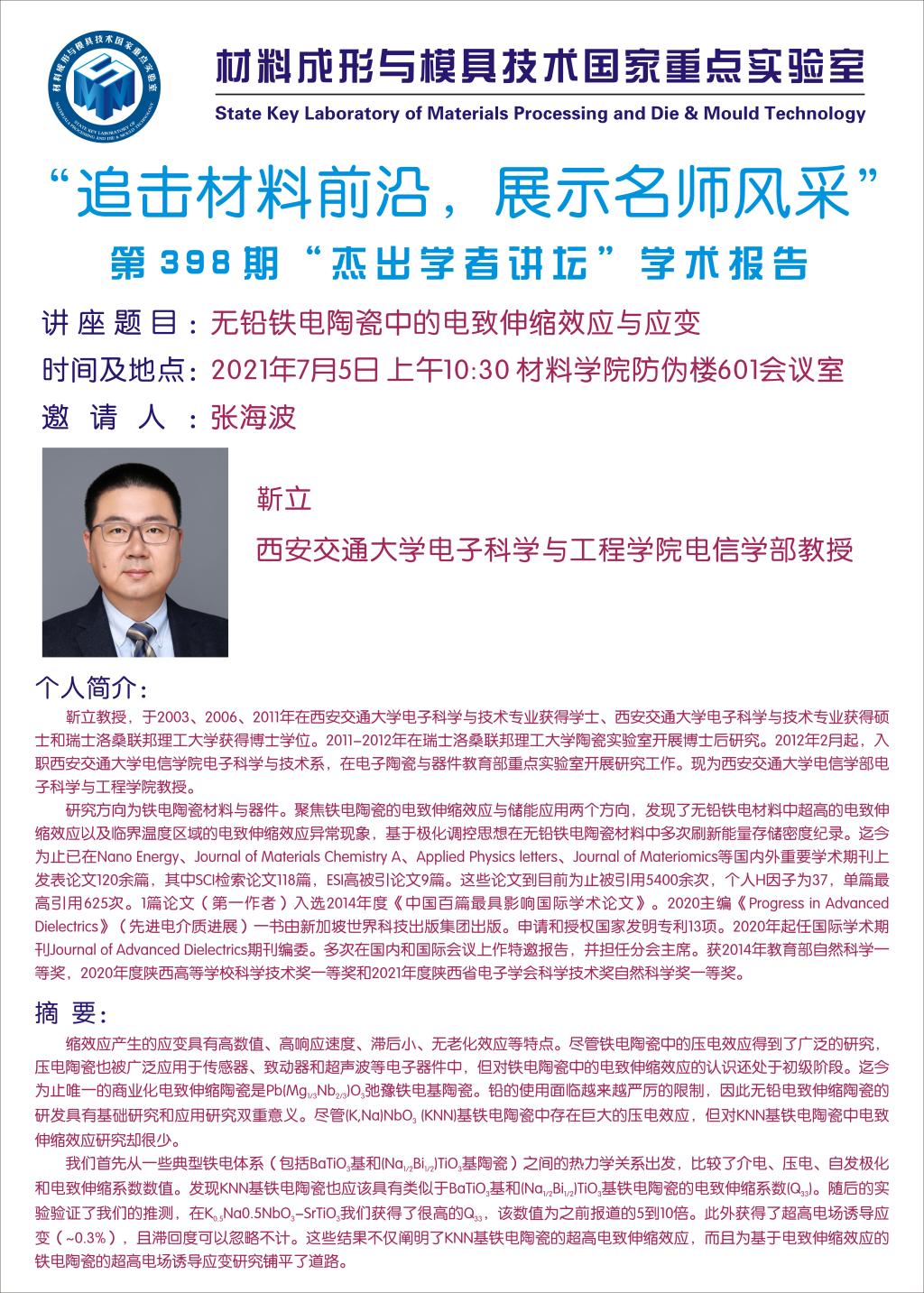 第398期杰出学者讲坛——西安交通大学教授靳立