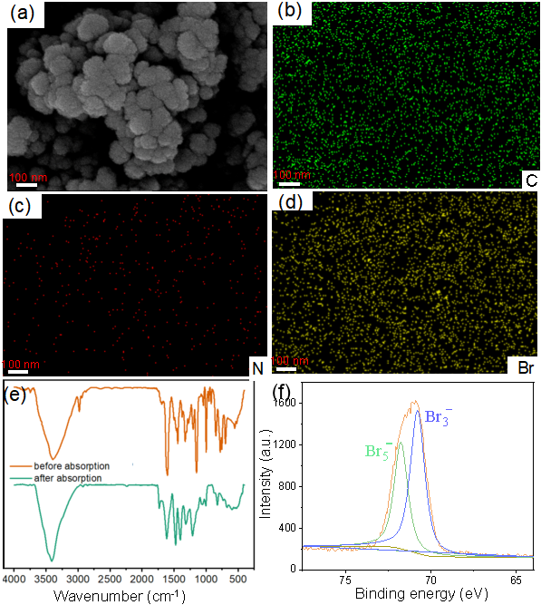 ▲图2. (a) 吸附溴后C4P-POP的SEM图像。(b-d)吸附溴后C4P-POP的EDS mapping。(e)吸附前后C4P-POP的FTIR光谱对比。(f)Br2@C4P-POP的Br 3d轨道的XPS光谱。