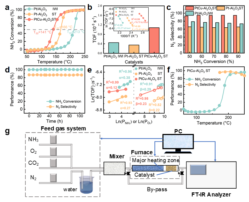 图2: (a) NH3氧化燃烧曲线,(b) Arrhenius图,(c) Pt/Al2O3 IWI样品(绿色),Pt-Al2O3 ST样品(橙色)和PtCu-Al2O3 ST样品(红色)NH3- SCO的N2选择性图,(d) PtCu-Al2O3 ST样品在190℃下100小时的稳定性测试。(e)氨和氧的反应级数。(f) PtCu-Al2O3 ST整体催化剂NH3-SCO性能;(g)小样测试示意图。