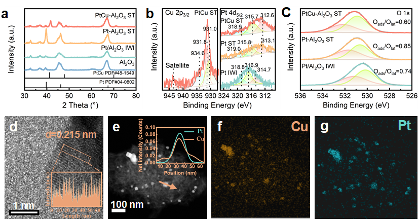 图3:(a)各种催化剂样品的XRD谱图,(b) Cu 2p, Pt 4d XPS谱,(c) O 1s XPS谱;Pt/Al2O3 IWI样品(绿色),Pt-Al2O3 ST样品(橙色),PtCu-Al2O3 ST样品(红色)。(d) HRTEM结果,(e) HAADF-STEM,插图显示PtCu合金在PtCu-Al2O3 ST样品上的线扫描,PtCu-Al2O3 ST样品的(f) Cu元素和(g) Pt元素的mapping分布图。