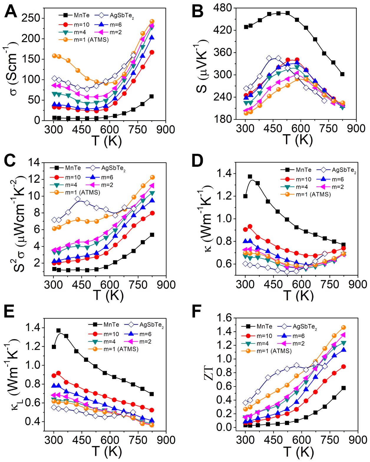 近日,华中科技大学杨君友教授(Junyou Yang)、罗裕波教授(Yubo Luo)与新加坡南洋理工大学颜清宇教授(Qingyu Yan)和美国西北大学Mercouri G. Kanatzidis教授研究团队合作,通过熵驱动实现了六方MnTe和立方AgSbTe2的化合,获得了立方结构的p型窄禁带AgMnSbTe3新型半导体热电材料。AgMnSbTe3具有岩盐矿NaCl晶体结构(其中 Ag、Mn、Sb共同占据Na节点位置)和多价带顶能带结构。该化合物具有优异的热电性能,热电优值ZT在823 K时为1.46,在400~773 K宽温域平均ZT值达0.87。该工作通过高熵设计合成了AgMnSbTe3新型化合物半导体热电材料,为热电材料的研究和开发提供了一种新思路,于近期发表在Journal of the American Chemical Society上。