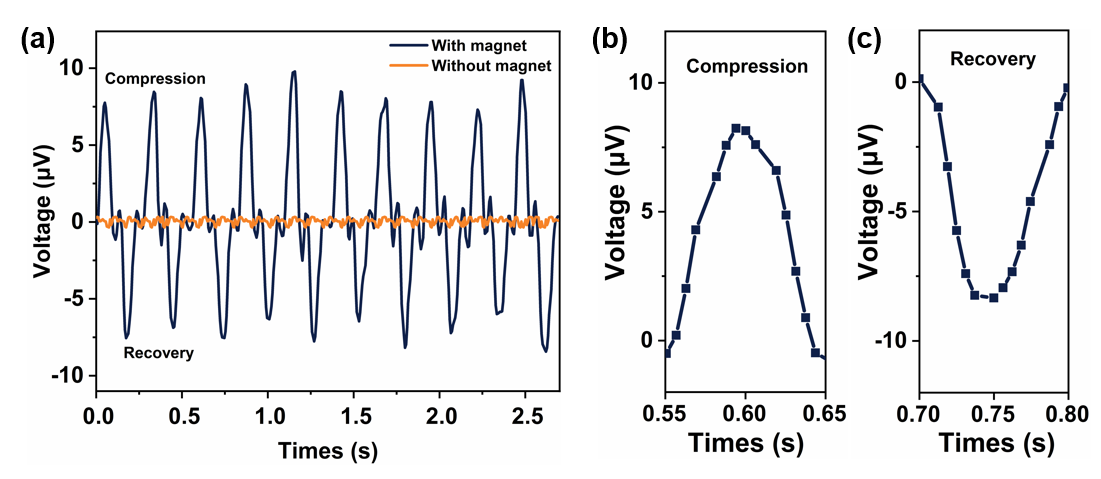 图3 4D打印成形柔性磁电器件在外力作用下产生的电压曲线图 (a) 磁粉含量为40 wt%、压缩速率为50 mm/s、磁电器件压缩的应变为20%时,器件在压力作用下产生的电压;(b)一个周期内压缩过程产生的电压;(c)一个周期内回复过程产生的电压