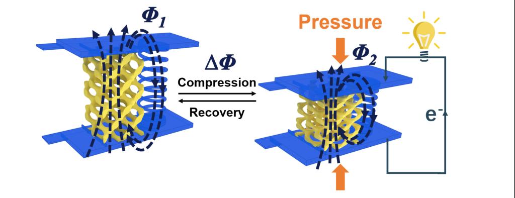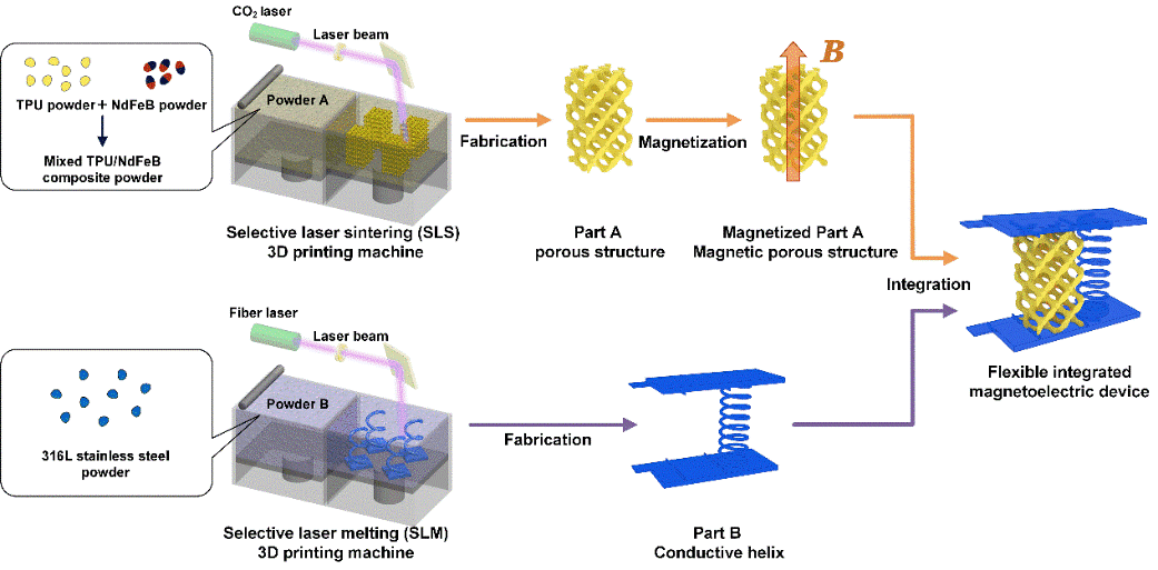 封面文章题为“A material combination concept to realize 4D printed products with newly-emerging property/functionality”,采用了一种全新的磁电材料组合的思想,将增材制造的磁性多孔结构和导电性的螺旋结构相组合,得到4D打印成形的柔性磁电器件,制备流程如图1所示。